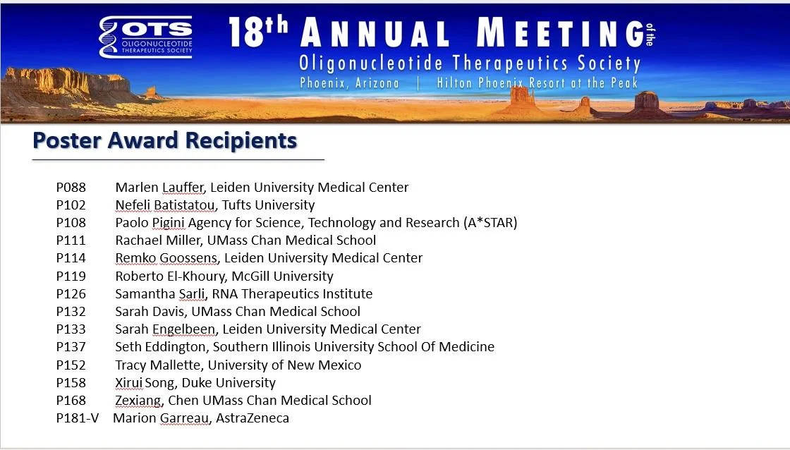 We are immensely grateful to all involved in this year’s meeting, especially OTS President David Corey, Ph.D. for your leadership and dedication to the advancement of oligonucleotide therapeutics.