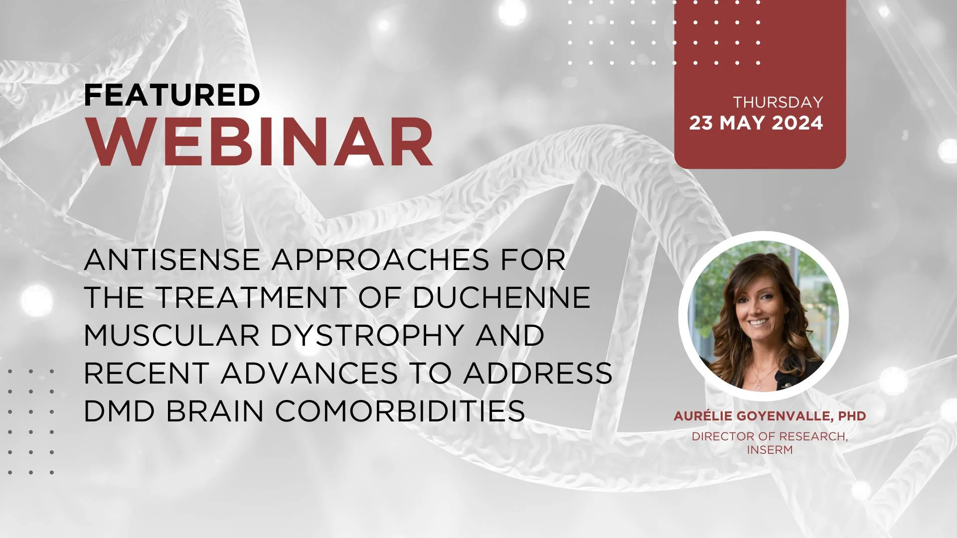 Date: May 23, 2024 Time: 8am PDT / 11am EDT / 5pm CEST Title: Antisense approaches for the treatment of Duchenne muscular dystrophy and recent advances to address DMD brain comorbidities Description: This presentation will cover the development of ASO-based approaches ...