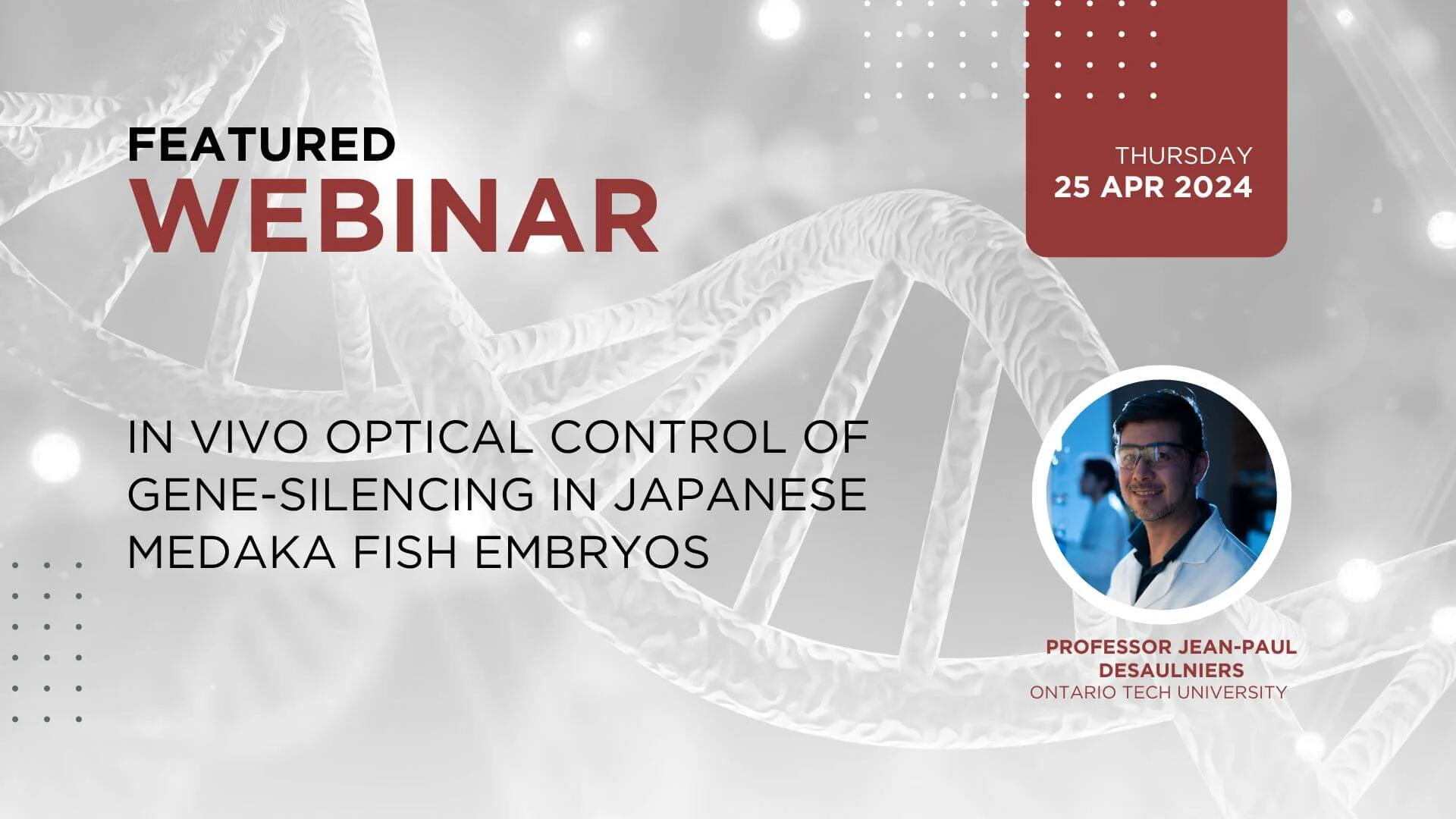 Time: 8am PDT / 11am EDT / 5pm CEST Date: April 25, 2024 Title: In vivo Optical Control of Gene-Silencing in Japanese Medaka Fish Embryos Description: The siRNA oligonucleotide duplex inherent to biology, functions by binding and cleaving mRNA, a process ...