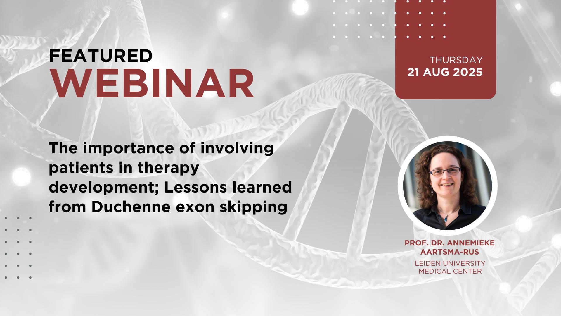 Date: August 21, 2025 Time: 11-12pm EDT / 5-6pm CEST Title: The importance of involving patients in therapy development; Lessons learned from Duchenne exon skipping Description: Duchenne muscular dystrophy is a progressive muscle wasting disease caused by lack of dystrophin protein. The exon skipping approach uses ...